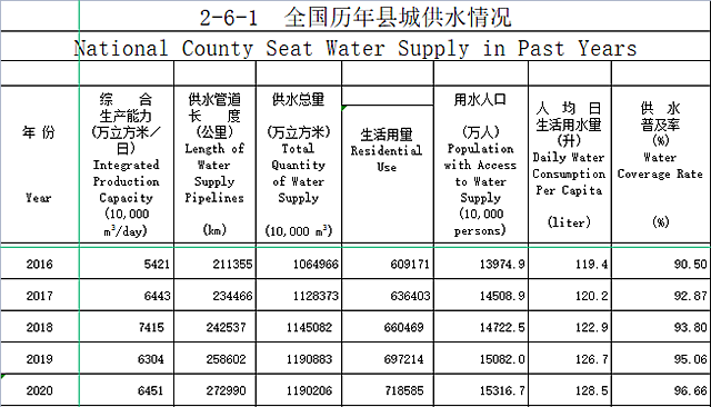截止2020年末,我國(guó)縣城供水普及率96.66%,較“十二五”增6.7%,建成區(qū)供水管道密度11.56公里/平方公里??h城污水處理率達(dá)95.05%,較“十二五”增加9.83%,污水處理廠集中處理率94.42%,集中建成區(qū)排水管道密度9.60公里/平方公里。