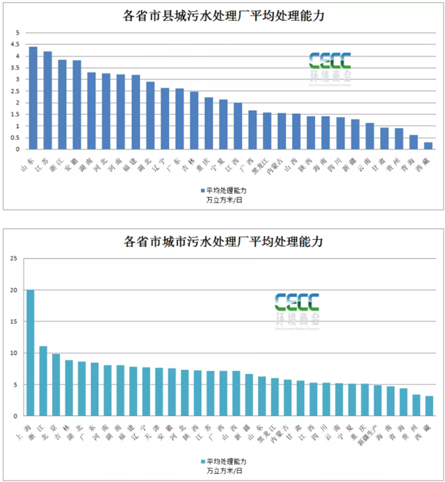 上一篇中提到的城市污水廠平均污水處理能力來看,除開上海的平均污水處理能力達(dá)20萬噸/日外,浙江省城市污水廠平均處理能力達(dá)11萬噸/日,吉林、湖北、廣東、河南、湖南等省市城市污水廠平均處理能力排在靠前的位置,大約在8萬噸/日??梢钥吹?,浙江省在城市和縣城的污水廠平均處理能力都排在前列,可見污水廠單體規(guī)模相對(duì)較大。山東、江蘇、安徽縣城污水處理廠平均處理能力較大,而城市污水處理廠則處在全國(guó)的中等水平。