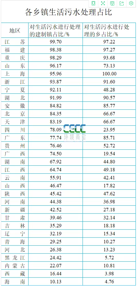 分省市來看,江蘇、福建、重慶、上海、浙江、湖北等6個(gè)省市90%以上鄉(xiāng)鎮(zhèn)生活污水實(shí)現(xiàn)處理,其他省市有不同程度缺口,具體如下: