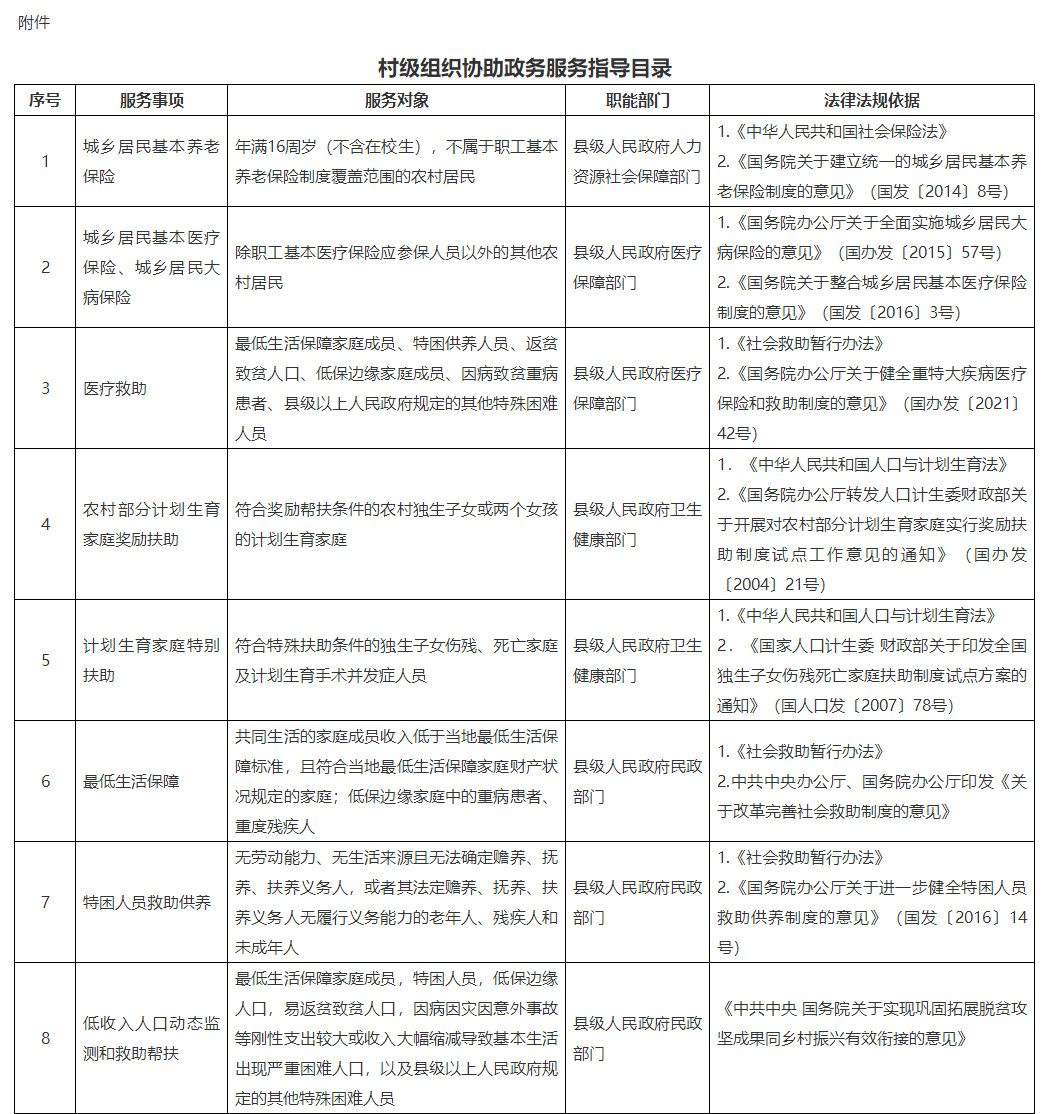 (一)依法協(xié)助辦理政務(wù)服務(wù)。指導(dǎo)村級(jí)組織根據(jù)協(xié)助政務(wù)服務(wù)目錄,結(jié)合實(shí)際細(xì)化辦理程序和辦法并公開,做好政務(wù)政策法規(guī)宣傳、信息發(fā)布、咨詢反饋等工作。協(xié)助落實(shí)重點(diǎn)群體走訪、監(jiān)測和救助幫扶等政策,做好基層治理數(shù)據(jù)采集校核工作。村委會(huì)要健全下屬公共衛(wèi)生委員會(huì),深入開展愛國衛(wèi)生運(yùn)動(dòng),協(xié)助做好重大疫情及突發(fā)公共衛(wèi)生事件、計(jì)劃生育特殊家庭扶助關(guān)懷等工作;健全下屬治安保衛(wèi)委員會(huì)和人民調(diào)解委員會(huì),協(xié)助完善群防群治機(jī)制,加強(qiáng)民間糾紛排查調(diào)處;健全婦女和兒童工作委員會(huì),協(xié)助做好未成年人保護(hù)和困境兒童、留守婦女關(guān)愛服務(wù),落實(shí)家暴性侵等違法犯罪行為發(fā)現(xiàn)報(bào)告和家庭監(jiān)護(hù)監(jiān)督制度。